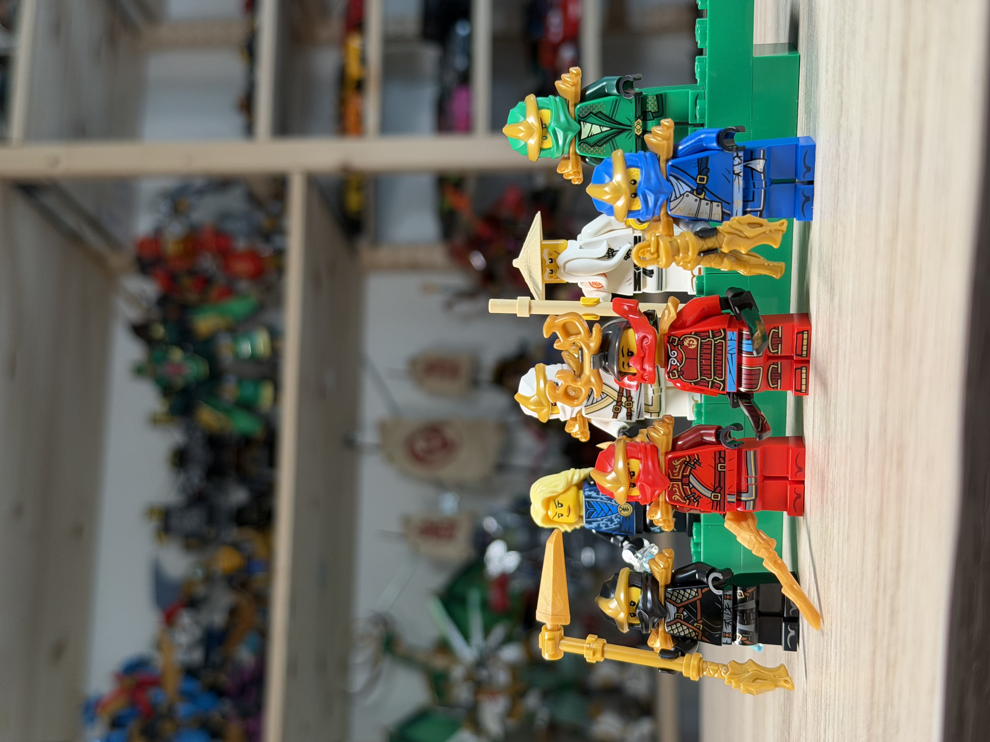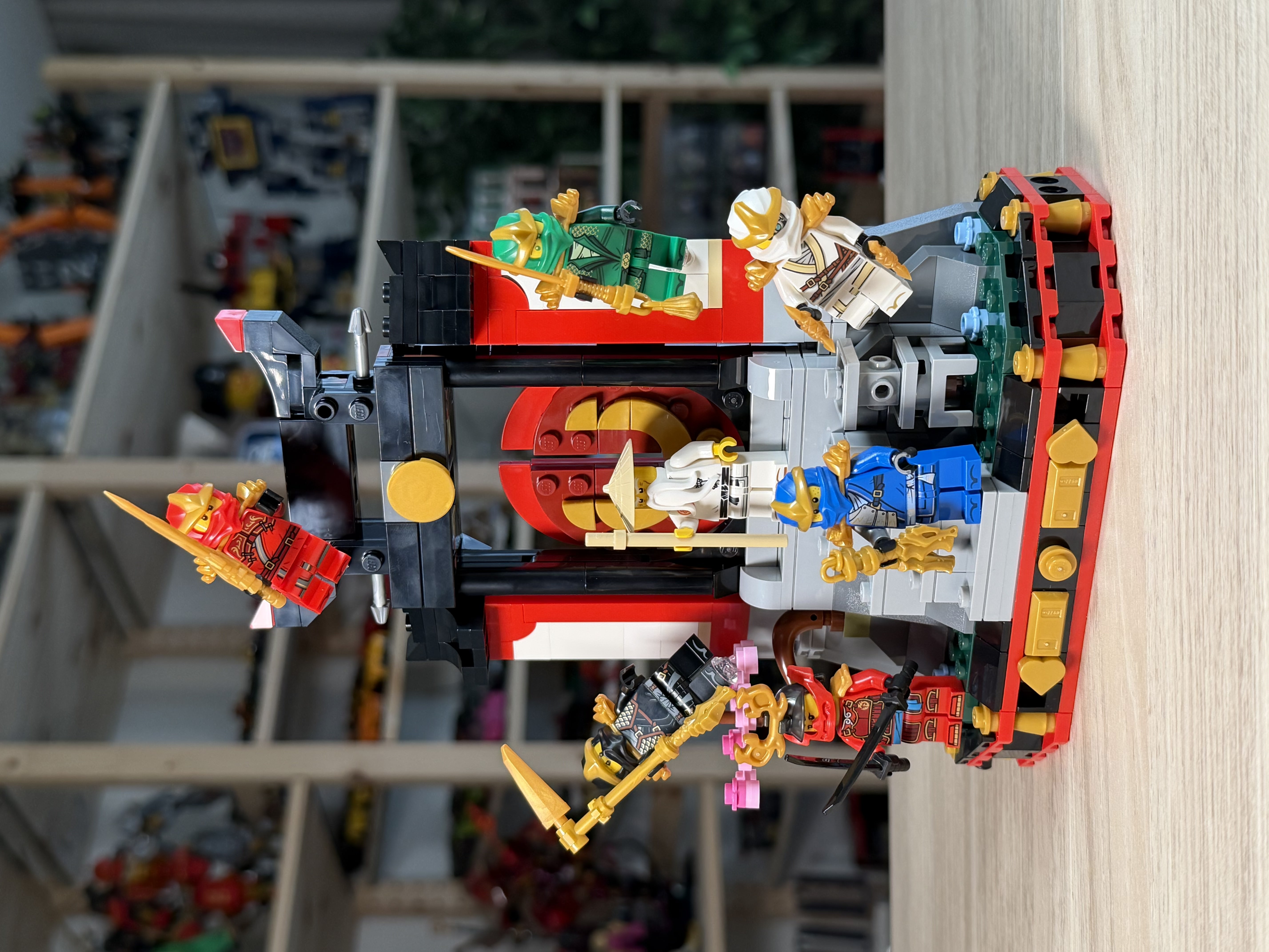The build centers around a structured display base designed to showcase the full lineup of characters. The focus is less on technical complexity and more on organized, thematic presentation. The structure feels solid, with decorative details referencing the NINJAGO universe, including elemental and symbolic touches.